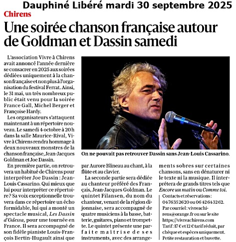Jean-Louis CASSARINO passe avec une facilité déconcertante de la chanson avec une voix exceptionnelle, à la comédie aussi bien dans des films au cinéma que dans des téléfilms à la télévision sans se priver du contact avec le public au théâtre. A Chirens nous avons pu le voir et l’apprécier dans un concert de Serge Reggiani et un autre de Jean Ferrat.